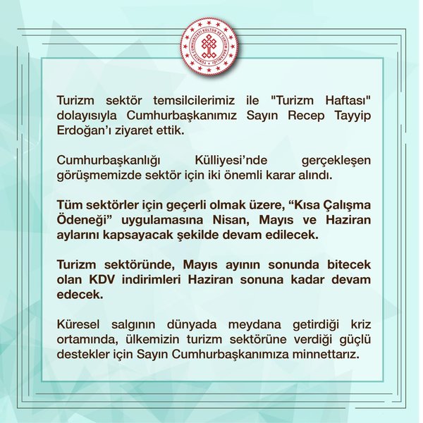 ''Turizm sektöründe, mayıs ayının sonunda bitecek olan KDV indirimleri Haziran sonuna kadar devam edecek. Küresel salgının dünyada meydana getirdiği kriz ortamında, ülkemizin turizm sektörüne verdiği güçlü destekler için Sayın Cumhurbaşkanımıza minnettarız.''