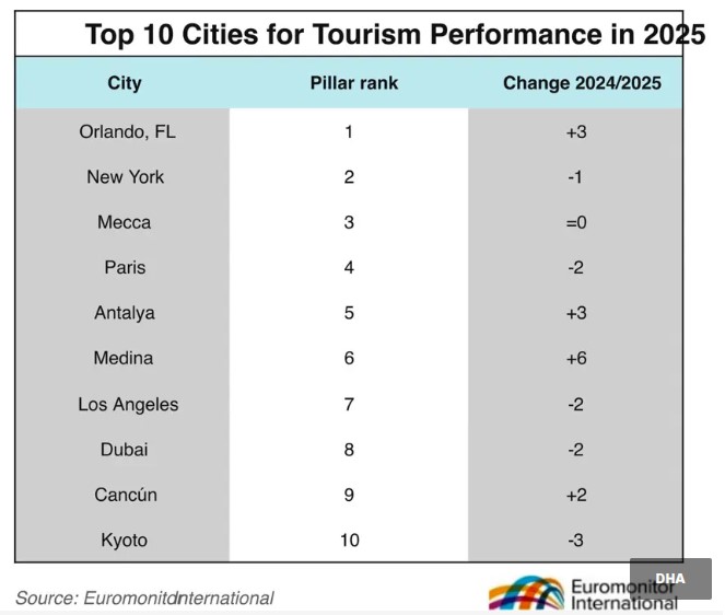 İşte Euromonitor’un 55 farklı göstergeyle belirlediği zirvedeki o 10 şehir;1- ORLANDO - FLORİDA2- NEW YORK - ABD3- MEKKE - SUUDİ ARABİSTAN4- PARİS - FRANSA5- ANTALYA - TÜRKİYE6- MEDİNE - SUUDİ ARABİSTAN7- LOS ANGELES - ABD8- DUBAİ - BİRLEŞİK ARAP EMİRLİKLERİ9- CANCUN - MEKSİKA10- KYOTO - JAPONYA
