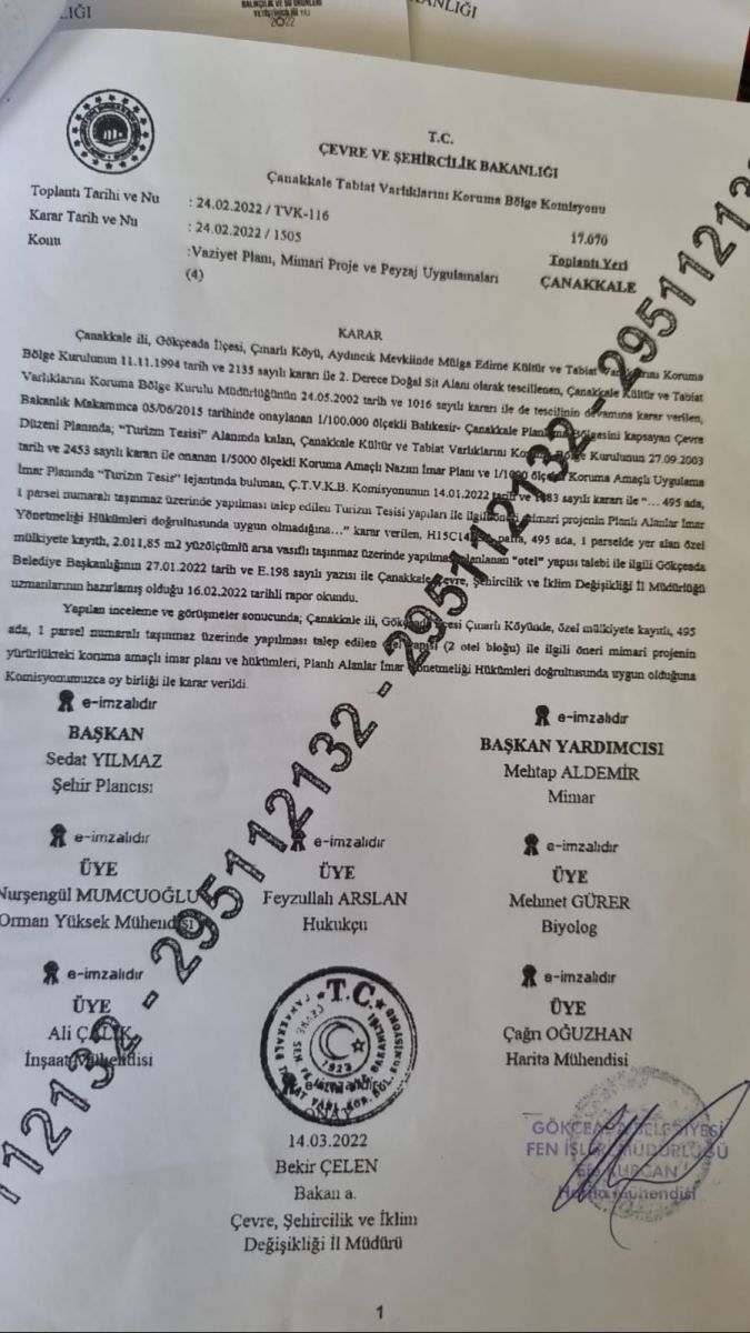Aradan yaklaşık bir ay geçtikten sonra özel mülkiyete ait olan 2.00.85 metrekare yüz ölçümlü arsa vasıflı taşınmaz üzerinde yapılması planlanan otel yapısı ile ilgili Gökçeada Belediye Başkanlığı, Komisyona 27 Ocak 2022 tarihinde bir yazı yazdı. Çevre il müdürlüğünün belgesinde, belediyenin içeriği açıklanmayan bu yazısının ardından Çanakkale Çevre ve Şehircilik İl Müdürlüğü uzmanları tarafından 16 Şubat 2022 tarihinde alanla ilgili hazırladıkları rapor Çanakkale Tabiat Varlıkları Koruma Bölge Komisyonu'nun 24 Şubat 2022 tarihli oturumunda okundu ve komisyon, özel mülkiyete ait taşınmaz üzerinde yapılmak istenen iki bloklu otel yapısına oy birliğiyle uygundur dedi.