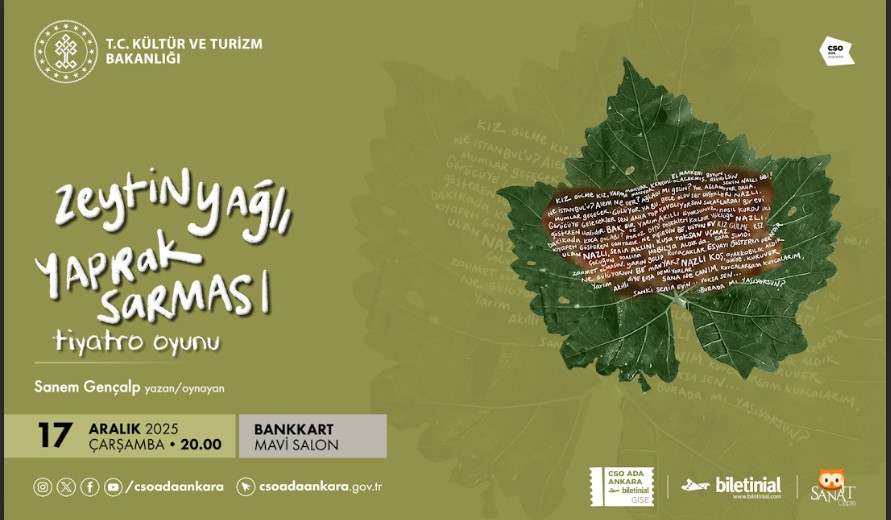 Turizm sektörünün haber radyosu Turizm FM'in haberine göre tek kişilik sahne performanslarının büyüleyici örneklerinden biri olan Zeytinyağlı Yaprak Sarması 17 Aralık 2025 Çarşamba günü saat 20.00’de Başkentin kültür ve sanat yaşamına yön veren cso ada ankara Bankkart Mavi Salon sahnesinde izleyiciyle buluşuyor.Koordinatörlüğünü Ahmet Sarsılmaz’ın yaptığı, büyük evlere sığamamış, küçük evlerden taşmış, yasaklarla azalmış, neşesine sığındıkça çoğalmış Nazlı’nın yaşamına odaklanarak, Trakya esintileriyle harmanlanmış neşeli bir trajediyi izleyicilere sunulan oyunun yazarlığını ve tek kişilik performansını Sanem Gençalp, yönetmenliğini Şenol Önder, dramaturgisini Arzu Önder, afiş tasarımını ise Funda Çevik Dinsdale üstleniyor.Oyunun etkileyici bir performansını sergileyen Sanem Gençalp, bu rolüyle 26. Sadri Alışık Sinema ve Tiyatro Ödülleri'nde Tek Kişilik Performans Dalında Yılın En Başarılı Kadın Oyuncusu kategorisine de aday gösterildi.BİLET FİYATLARI:1. Kategori: 750 TL2. Kategori: 500 TLDetaylı bilgi için; https://csoadaankara.gov.tr adresini ziyaret edebilirsiniz.Biletler; ‘biletinial.com’ adresi, ‘SanatCepte’ uygulaması ve CSO Ada Ankara fuaye alanındaki Biletinial gişesi üzerinden temin edilebilir.
