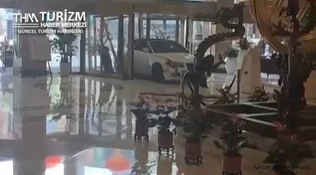 Sözlü tartışmanın ardından otelden çıkan ve otoparktaki lüks spor otomobiline binerek geri dönen öfkeli müşteri, otel lobisine spor aracıyla girerken uyarılara rağmen geri adım atmayan müşteri, otomobiliyle resepsiyonun önüne kadar ilerledi.