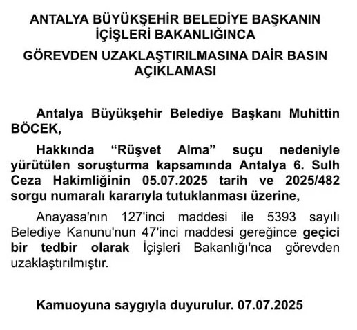 Turizm sektörünün haber radyosu Turizm FM'in haberine göre hakkında yürütülen soruşturma kapsamında tutuklanan antalya Büyükşehir Belediye Başkanı muhittin böcek hakkında alınan karar ile ilgili İçişleri Bakanlığı tarafından yapılan açıklamada şu ifadelere yer verildi:''Antalya Büyükşehir Belediye Başkanı Muhittin Böcek hakkında Rüşvet Alma suçu nedeniyle yürütülen soruşturma kapsamında Antalya 6. Sulh Ceza Hakimliğinin kararıyla tutuklanması üzerine, Anayasa'nın 127'inci maddesi ile 5393 sayılı Belediye Kanunu'nun 47'inci maddesi gereğince geçici bir tedbir olarak İçişleri Bakanlığı'nca görevden uzaklaştırılmıştır.''5 Temmuz 2025 tarihinde CHP'li belediyeler Adana ve Adıyaman'la birlikte Antalya'ya da düzenlenen operasyonlarda Adıyaman Belediye Başkanı Abdurrahman Tutdere, Adana Büyükşehir Belediye Başkanı Zeydan Karalar ve Muhittin Böcek gözaltına alınmıştı.Antalya Cumhuriyet Başsavcılığı tarafından yürüttülen soruşturma kapsamında gözaltına alınan Böcek, aynı gün çıkarıldığı adliyede savcılık ifadesinin ardından sevk edildiği Sulh Ceza Hakimliği tarafından 5 Temmuz'da tutuklanmıştı.