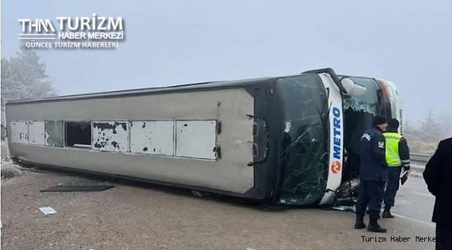 Ankara Çankırı kara yolu Çandır mevkisinde meydana gelen kaza ile ilgili olarak edinilen bilgiye göre Çankırı’dan Ankara’ya gelen 34 DT 5502 plakalı Metro Turizm’e ait yolcu otobüsü sürücünün direksiyon kontrolünü kaybetmesi sonucu devrildi.